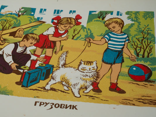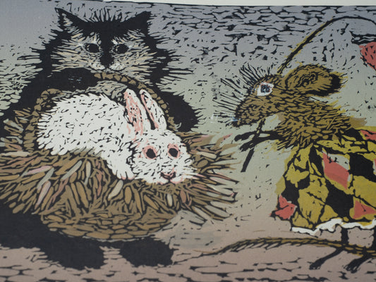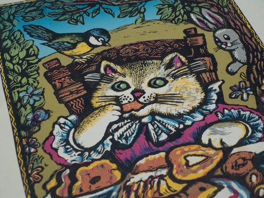 Vintage Soviet Linocut – Cat, Mouse & Bunny