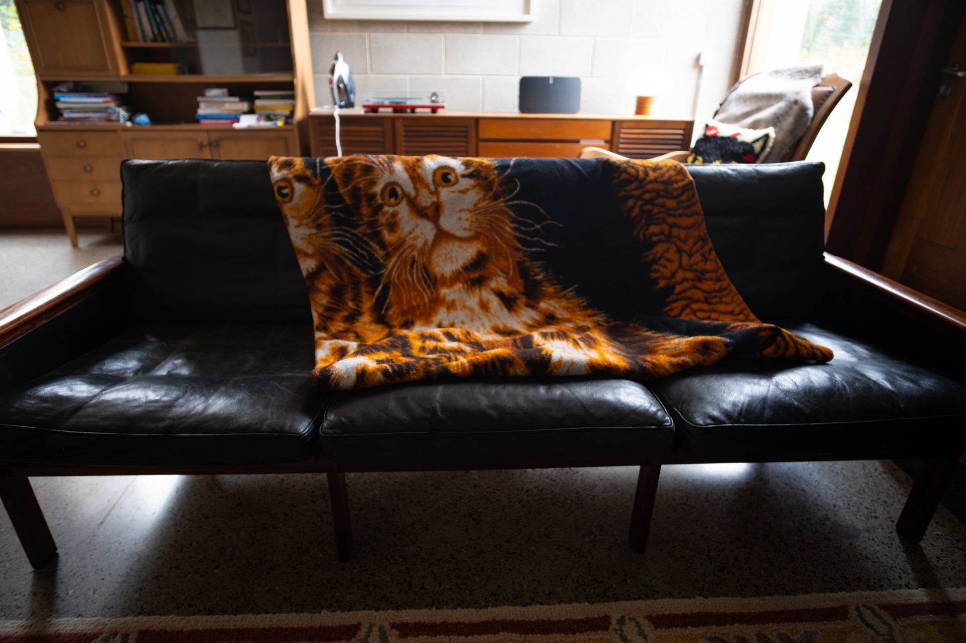 Maker: No maker detail but many of these novelty cat and dog blankets were produced in Spain, Portugal, or Eastern Europe during this period, often sold as both throws and wall tapestries.